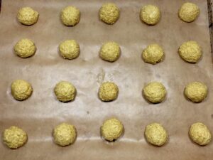 7. Stich mit einem Teelöffel etwas von der Masse ab und forme es mit Hilfe deiner angefeuchteten Hand zu einer Kugel. Leg diese auf das Backblech. Du kannst die Kugeln auch mit Hilfe eines Bechers flach drücken, wenn du magst.