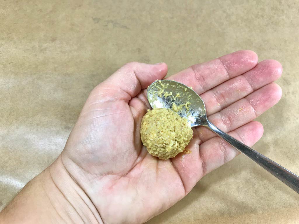 7. Stich mit einem Teelöffel etwas von der Masse ab und forme es mit Hilfe deiner angefeuchteten Hand zu einer Kugel. Leg diese auf das Backblech. Du kannst die Kugeln auch mit Hilfe eines Bechers flach drücken, wenn du magst.